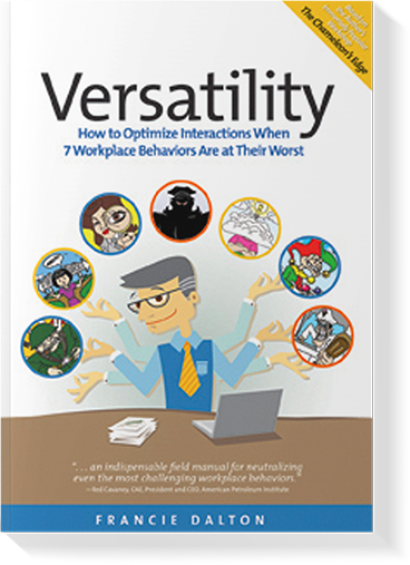 Her book, Versatility: How to Optimize Interactions When 7 workplace Behaviors Are at Their Worst, is a chilling look at seven personality types. Six are not desirable; the seventh is. With witty cartoon characters and accurate, if aggregated, examples of personalities we all face, Ms. Dalton lays out the challenges and drawbacks of each: The Commander, The Drifter, The Attacker, The Pleaser, The Performer, The Avoider, The Analytical and The Achiever.